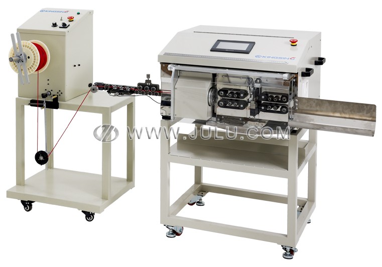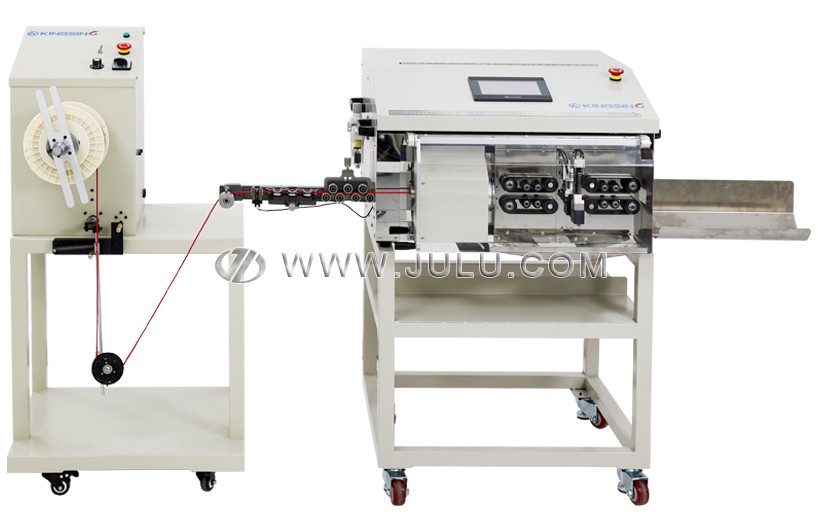 本机还配有适用于半柔同轴电缆的自动送线机,它可以和剥线机联动,需要线材是自动启动送线,不需要线材时自动停机。送线机可以保持送线张力的稳定,有利于提高送线精度和运行的稳定性。